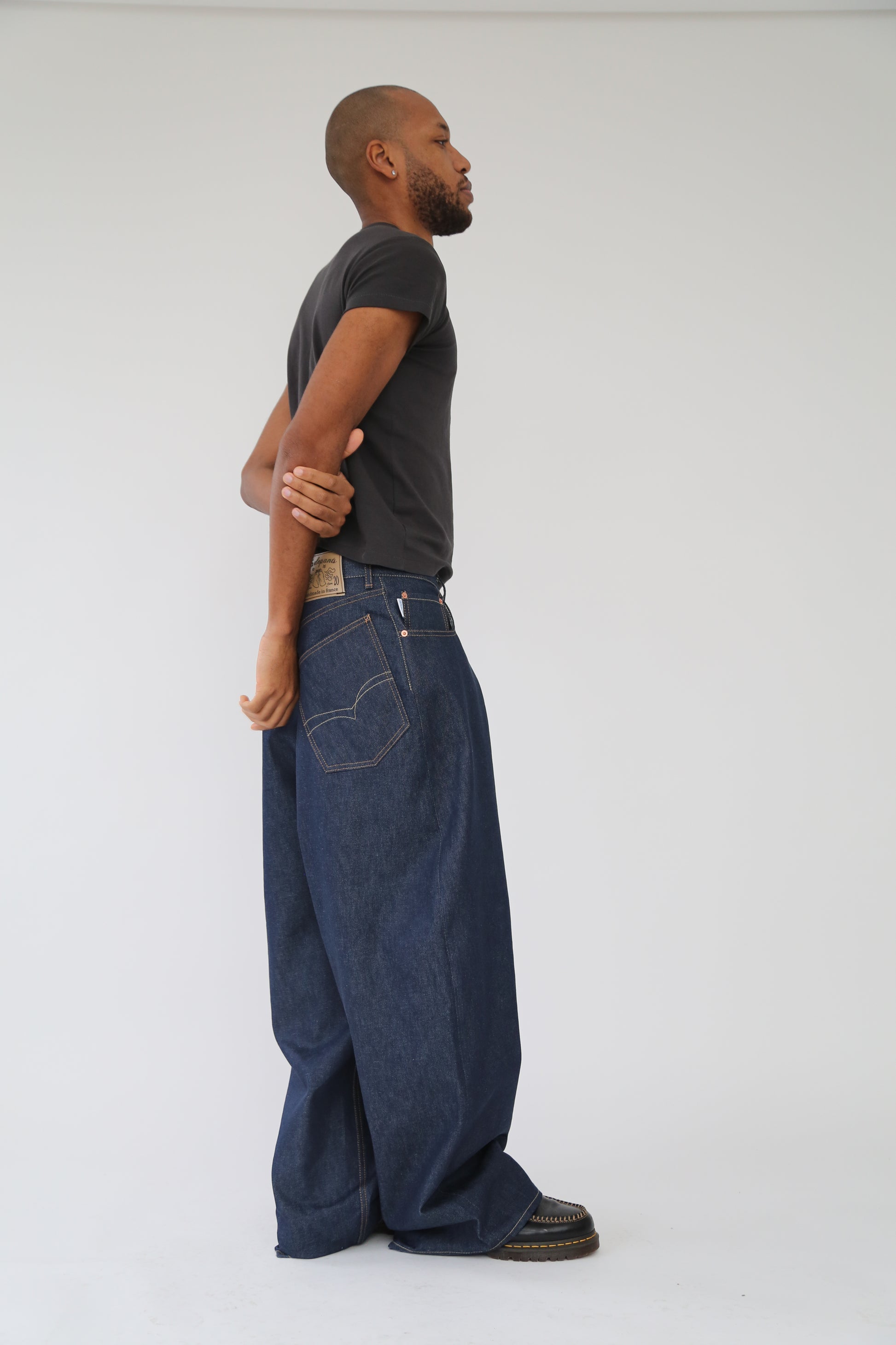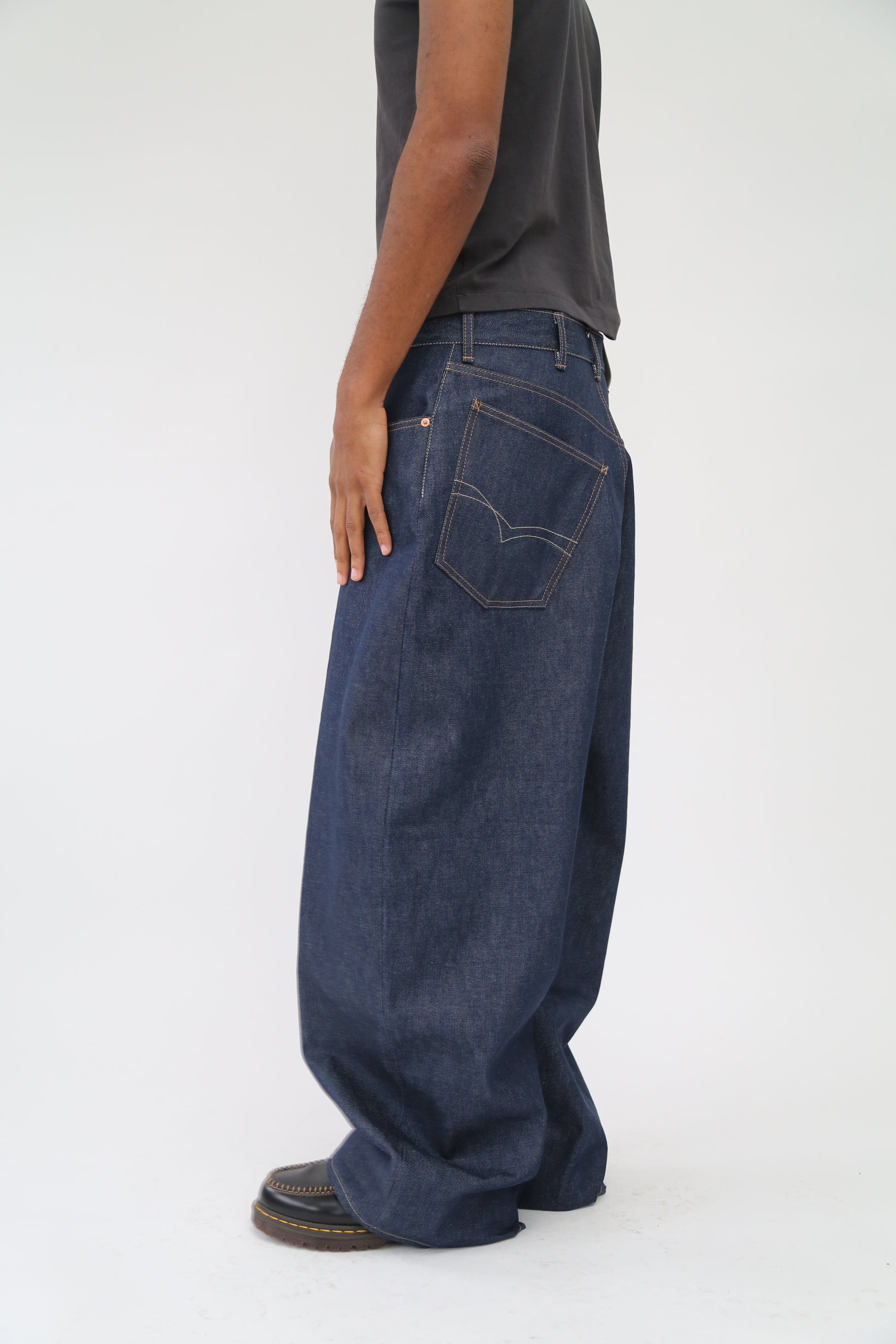 5 pockets style Jeans with super baggy fit, subtle curve and fitting waist. Wide thigh and long rise.
